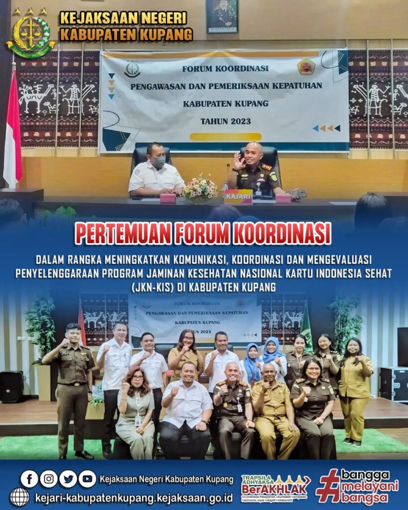 Pada hari Senin, 26 Juni 2023 bertempat di Fatuleu Hall Kejaksaan Negeri Kabupaten Kupang, Kepala Kejaksaan Negeri Kabupaten Kupang, Muhammad Ilham, S.H., M.H. dan Kepala BPJS Kesehatan Cabang Kupang beserta anggota Forum telah melaksanakan Rapat Forum Koordinasi Pengawasan dan Pemeriksaan Kepatuhan tingkat Kabupaten Kupang, dalam rangka meningkatkan komunikasi, koordinasi, dan mengevaluasi penyelenggaraan Program Jaminan Kesehatan Nasional Kartu Indonesia Sehat (JKN-KIS) di Kabupaten Kupang.